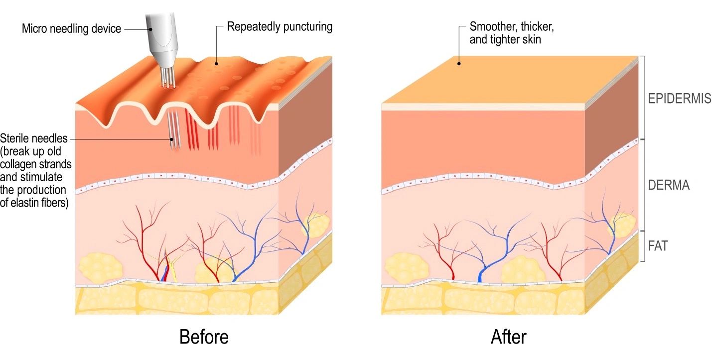 Microneedling results in the production of new collagen and elastin, improvement in skin tone and texture, firmness as well as reduction in scars, pore size, and stretch marks.